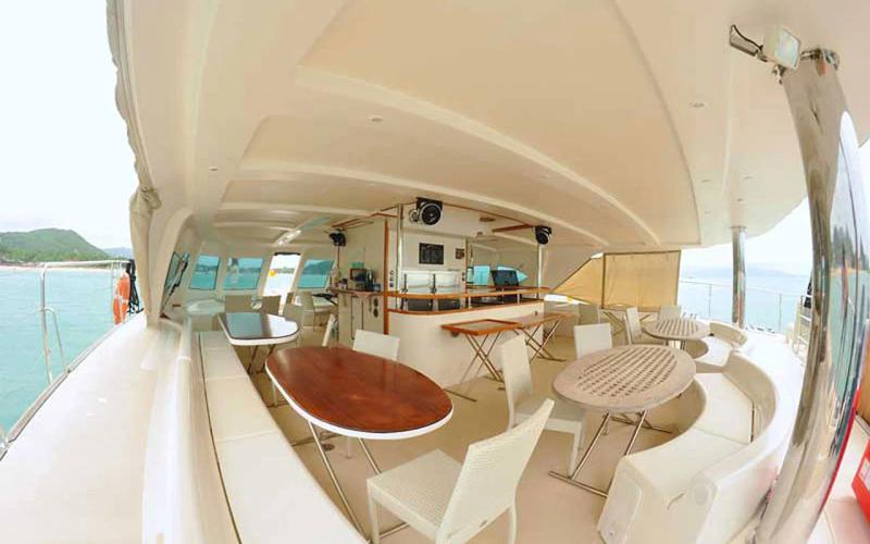 You will cruise with a speed of 10 knots on your trip to Ang Thong National Marine Park (9h) and be impressed by amenities like Flying Bridge, Foldable swim ladder, Freshwater Shower, Multiple Decks, Multiple washrooms, Sun-protected area / Awning, Trampoline as well as 2 Paddle boards, Fishing gear (on request), Kayak, Snorkeling masks, Water slide (full- / half-day).