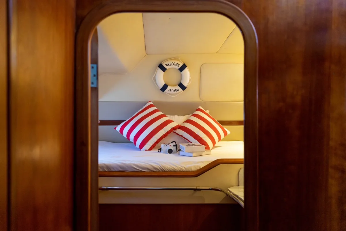With 3 cozy cabins (and bathrooms), a spacious deck, and a bright salon with panoramic views, Clare is ideal for relaxing escapes or fun-filled group outings. Enjoy swimming & play waterr slide, kayaking, SUP, fishing, or just soaking in the views – all part of your unforgettable journey.