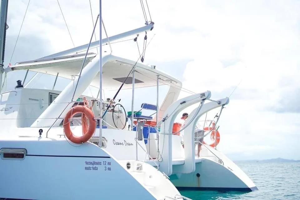 It has a large cockpit, plenty of seating in the shaded rear section and the typical relaxation area on the front trapezes. The saloon and galley allow for ample entertaining and cooking facilities. 2 air-conditioned cabins, 2 bathrooms.