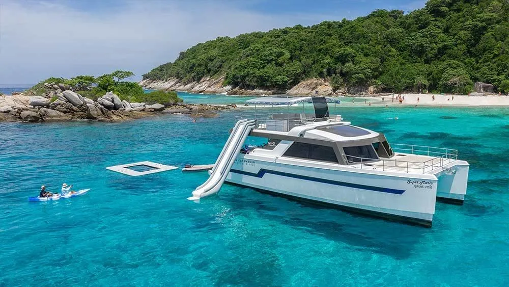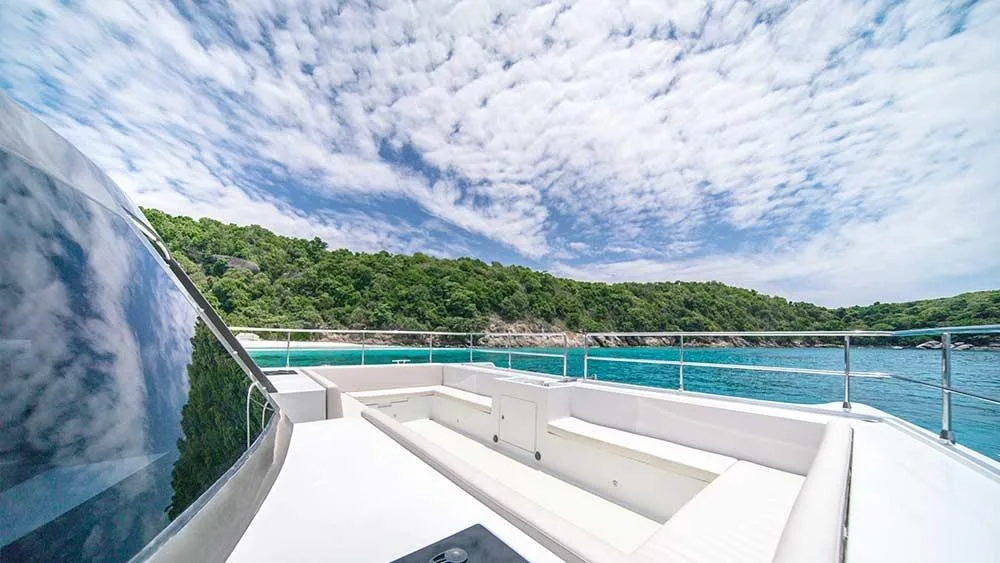 This power catamaran is one of our best choices in Phuket for larger groups. Very child-friendly Charter Yacht to rent due to its stability in waves, the water slide and a variety of other water sports. Pure fun for a maximum of up to 55 guests.