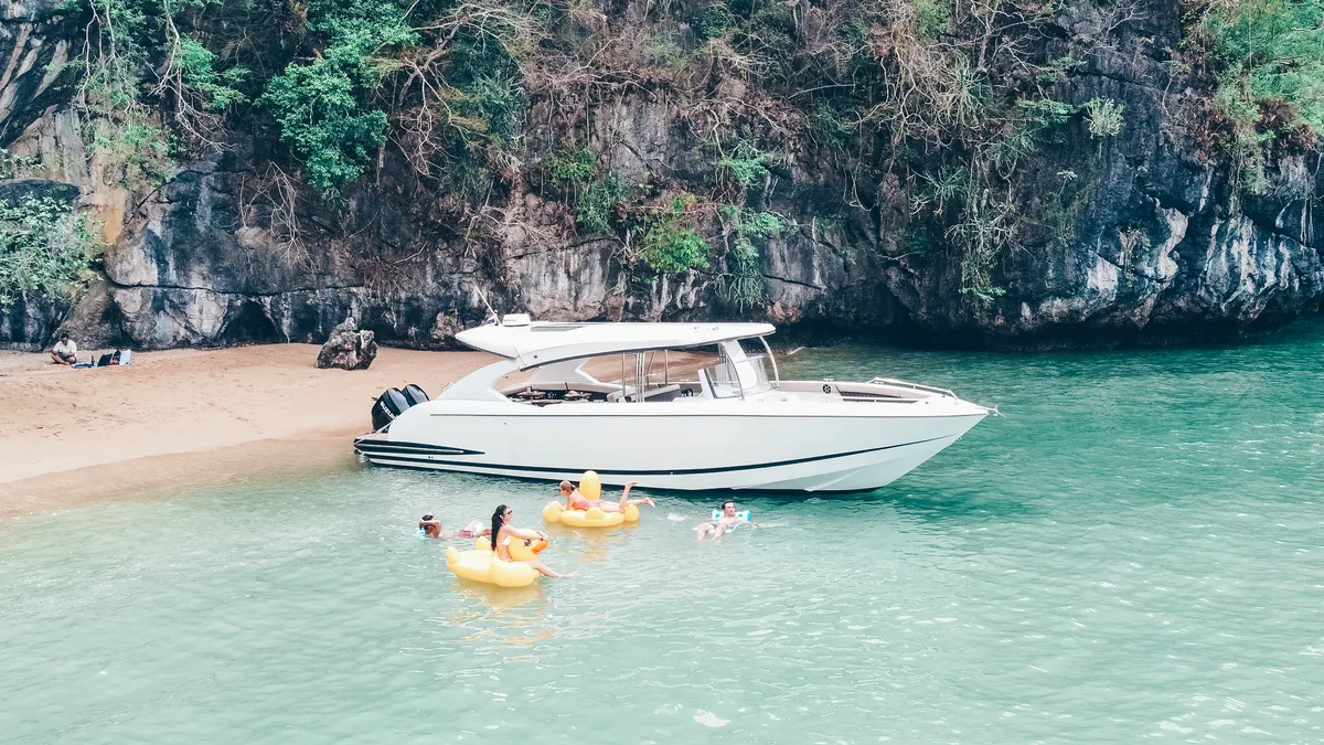 Our brand-new 2025 luxury speedboat for private Charter redefines exciting island-hopping in Phuket for up to 20 passengers. Designed for comfort and performance, it offers spacious seating and modern features like high-end sound system.