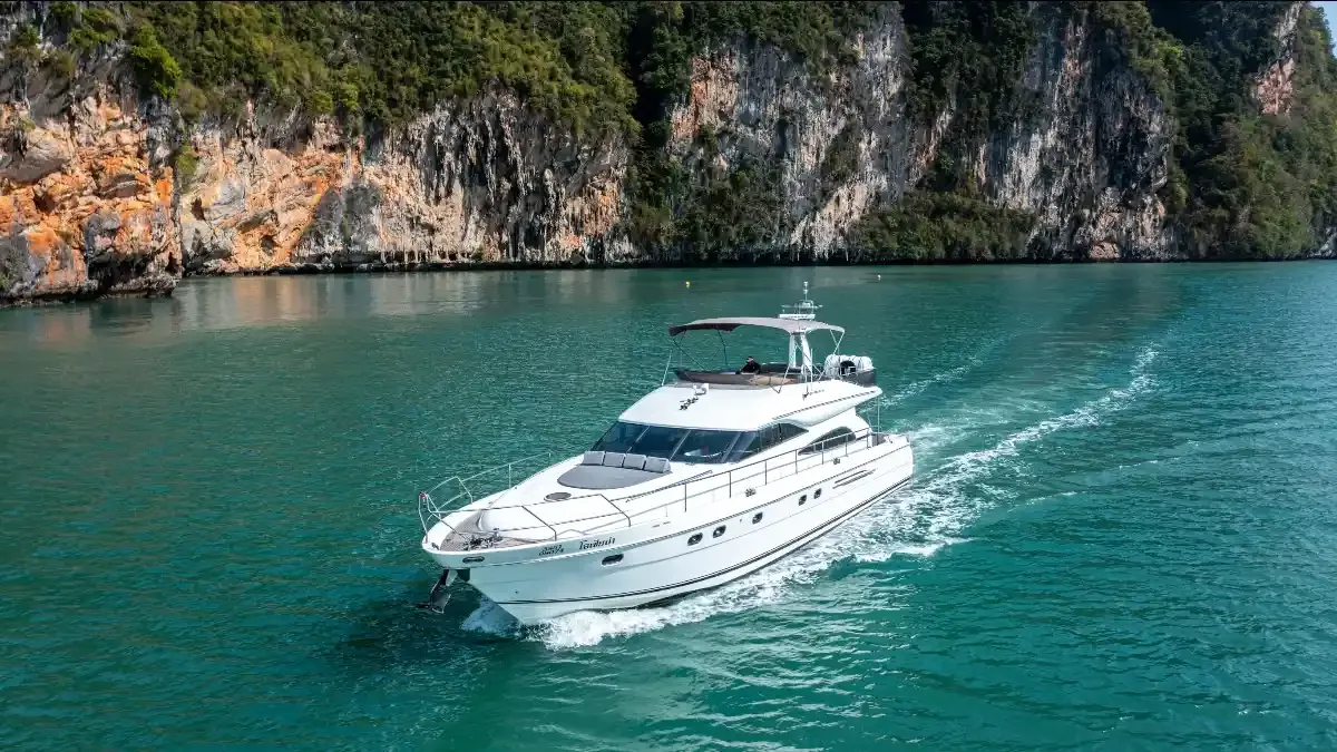 This magnificent 65ft flybridge Yacht for Charter at Krabi comes with huge outdoor areas for relaxing and sunbathing, as well as superior equipment & service level and a high degree of luxurious comfort.