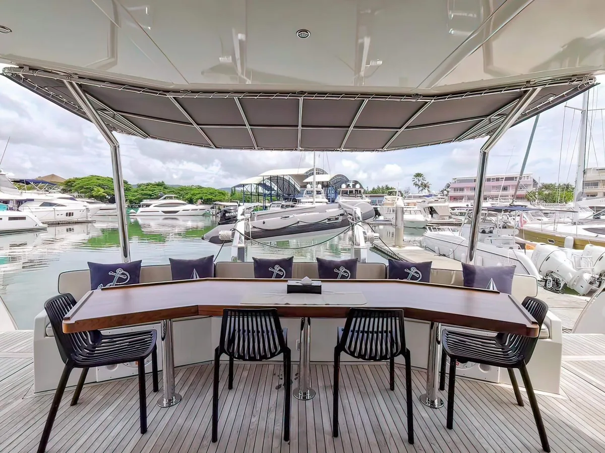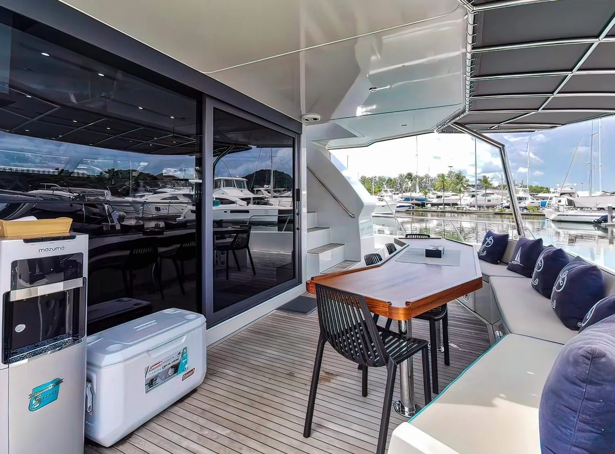 A fast speedster that comfortably takes smaller groups of up to 15 people to the most beautiful spots on the Andaman Sea and, not least thanks to the flybridge and the full equipment, is pure enjoyment. Private yacht charter in Phuket in best form!