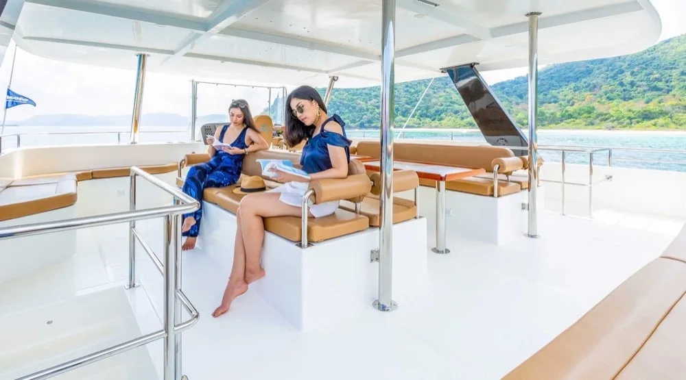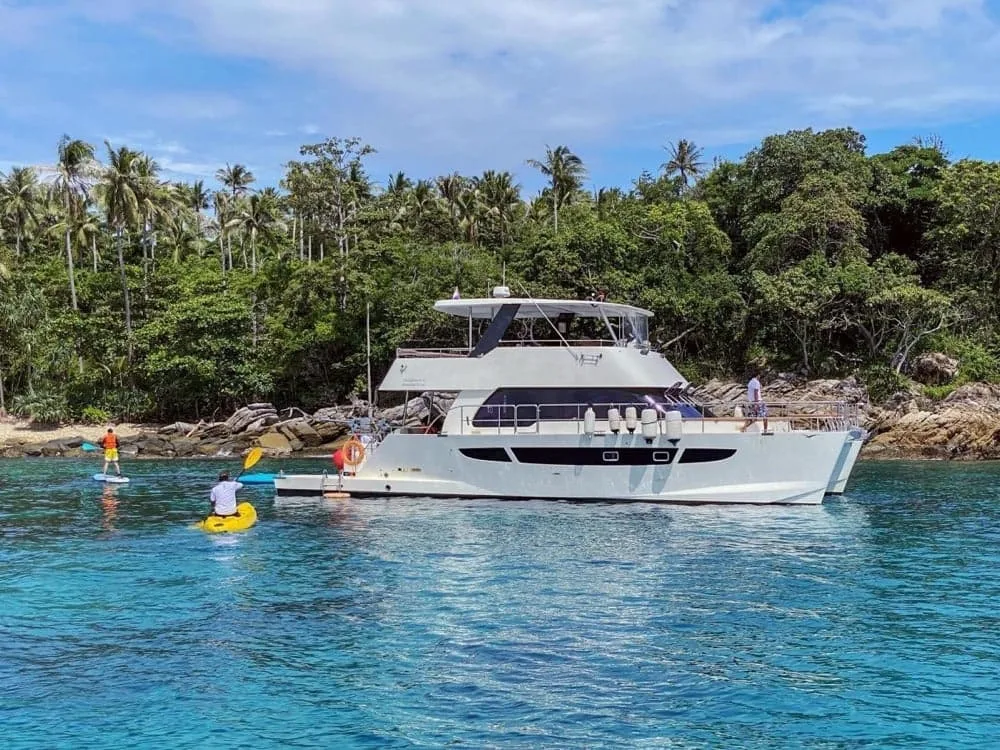 This is the right charter yacht for groups who like to sail with fun and plenty of space. Perfect power catamaran in Phuket for parties with family or friends. Water slider and inflatable pool included (on full-day tours).