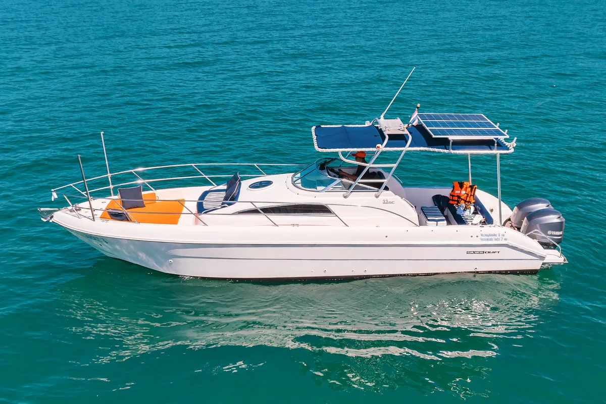 The infamous manufacturer Gulf Craft has managed to make sense of every inch of this 33ft boat, so that it offers an incredible amount of space in the bow and stern and even includes a cabin with a kitchenette and toilet.