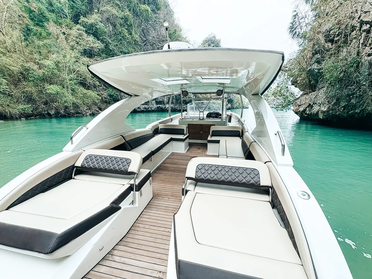 Our brand-new 2025 luxury speedboat for private Charter redefines exciting island-hopping in Phuket for up to 20 passengers. Designed for comfort and performance, it offers spacious seating and modern features like high-end sound system.