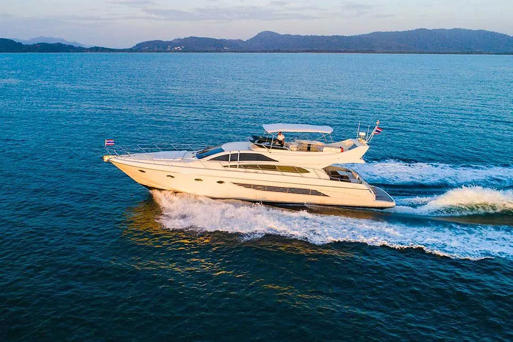 You will cruise with a speed of 18 knots on your trip to Phi Phi Island (8h) and be impressed by amenities like Flying Bridge, Freshwater Shower, Hot Water, Multiple Decks, Multiple washrooms, Saloon, Sun-protected area / Awning as well as Fishing gear (on request), Floating Sofa, Inflatable Toys, Kayak, Paddle board, Snorkeling masks & fins.