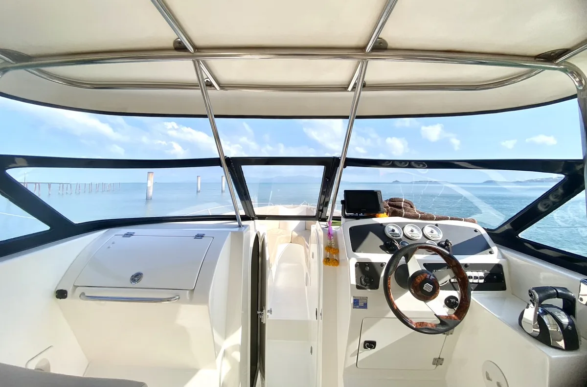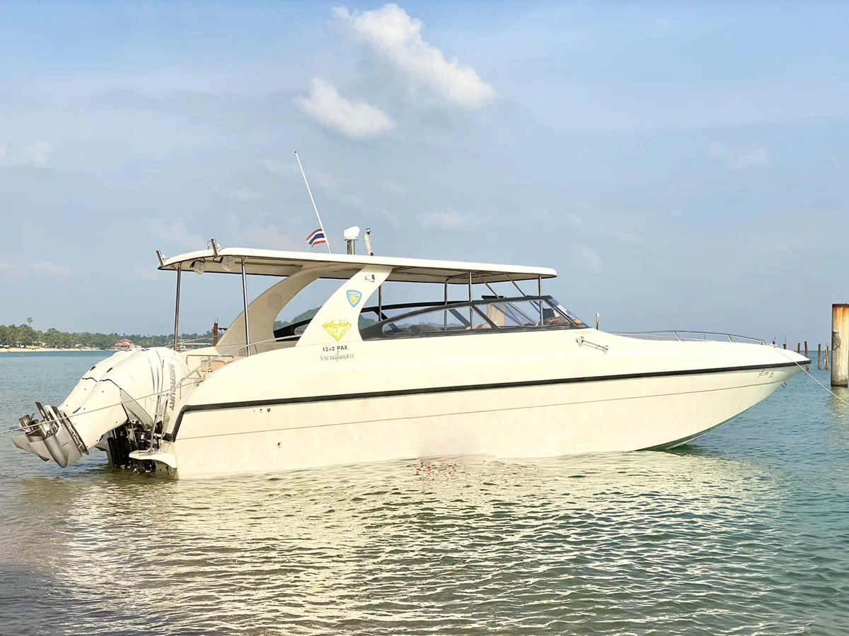 This comfortable 38ft Sports Cruiser for Charter in Samui is manufactured by Seat Boat, Thailand’s most established boat builder. She carries a maximum of 8 passengers and is perfect for a group of 6 with ample seating in the rear cabin along with a day bed and open seating area in the bow.