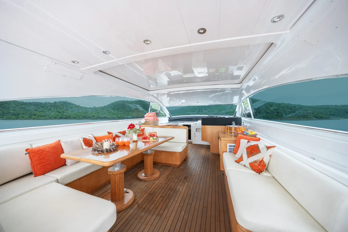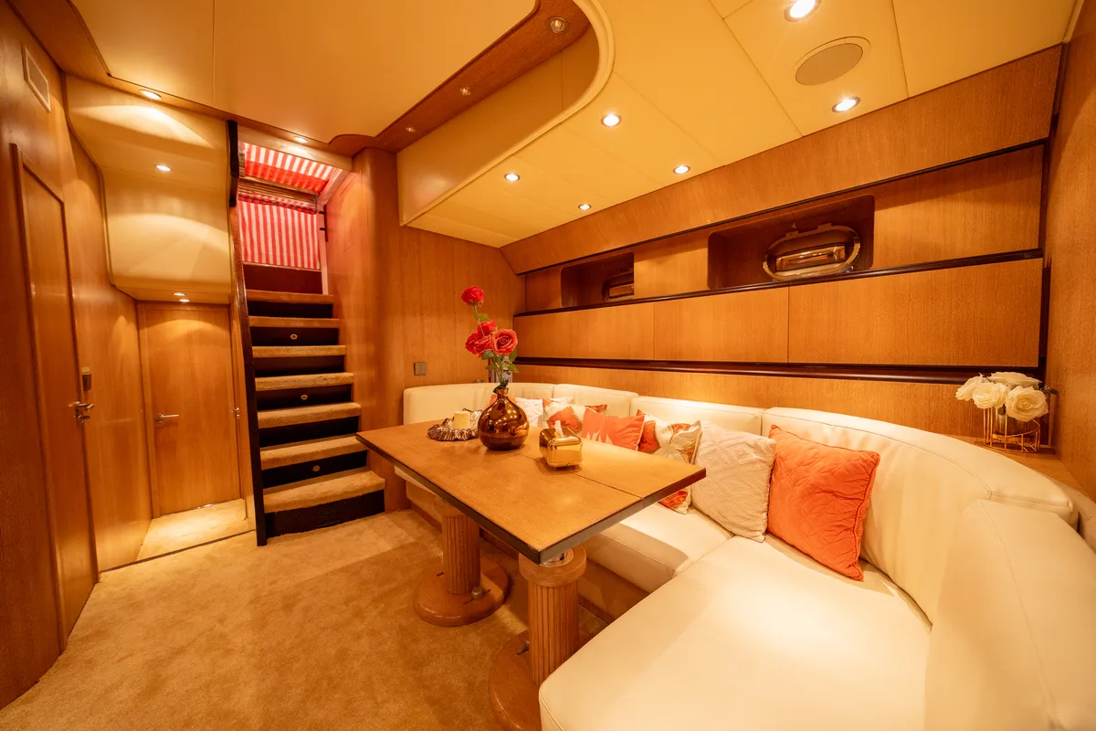 Her sporty exterior is complemented by generous outdoor living spaces and a variety of watersport amenities, including a slider and floating pool, ensuring endless enjoyment on the water. Below deck, the interior offers elegant accommodation for six guests across three beautifully appointed cabins, each with en-suite facilities. The full-beam master suite, located amidships, boasts exceptional volume and natural light, while a forward VIP cabin and a twin guest cabin provide additional comfort and privacy.