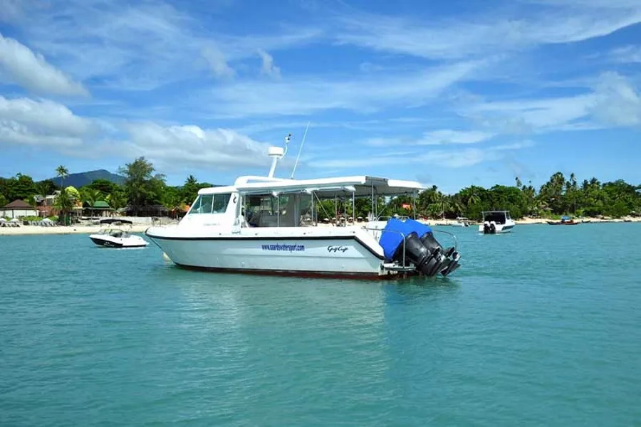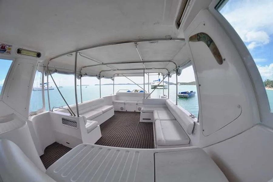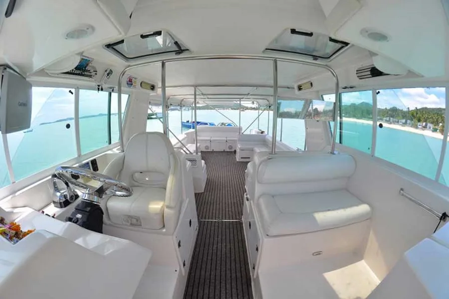 Fast & furious! 36ft fully enclosed fiberglass powerboat made by the Gulf Craft Group, powered by two 300HP Suzuki 4 stroke engines for a quiet and smoke free ride.