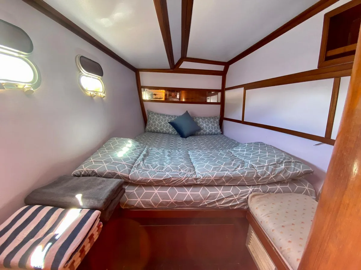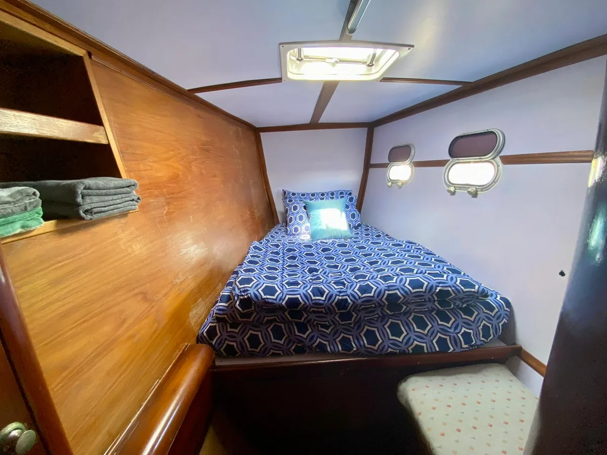 A total of 4 cabins and 4 bathrooms are available for overnight trips with up to 8 guests.