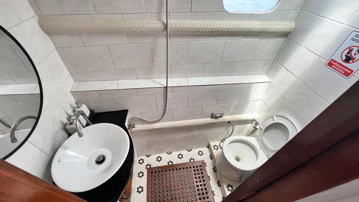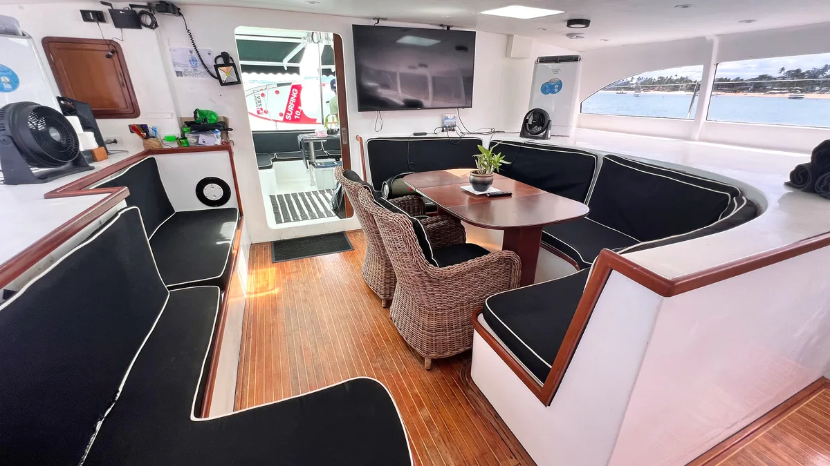 The spacious saloon with a large dinner table and flat screen TV is just as air-conditioned as the 4 double cabins.