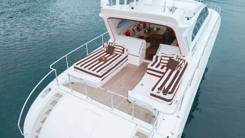 Her sporty exterior is complemented by generous outdoor living spaces and a variety of watersport amenities, including a slider and floating pool, ensuring endless enjoyment on the water. Below deck, the interior offers elegant accommodation for six guests across three beautifully appointed cabins, each with en-suite facilities. The full-beam master suite, located amidships, boasts exceptional volume and natural light, while a forward VIP cabin and a twin guest cabin provide additional comfort and privacy.