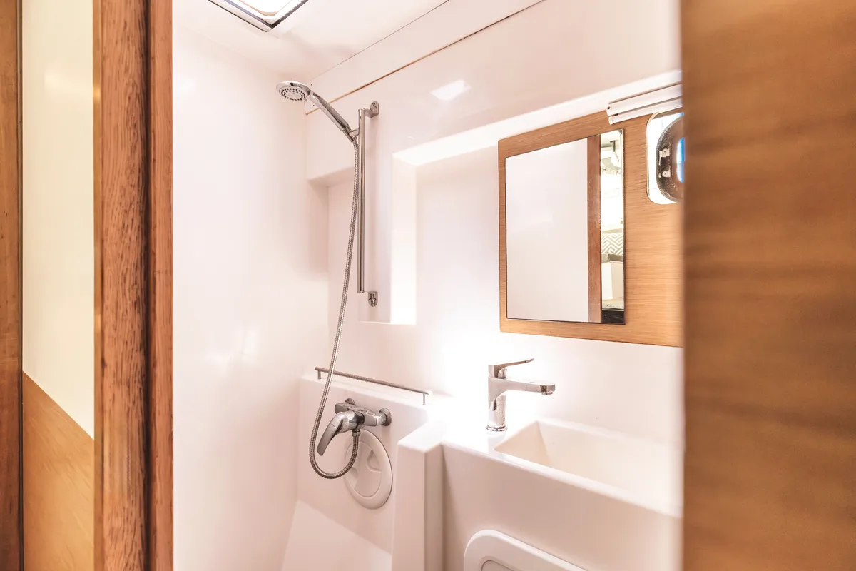 She offers plenty of shaded lounging space, a stable sailing experience, and smooth access to the water — perfect for swimming, paddling, or simply enjoying the view. Includes a stand-up paddleboard, dinghy, optional floating pool and all the essentials for a laid-back island escape.