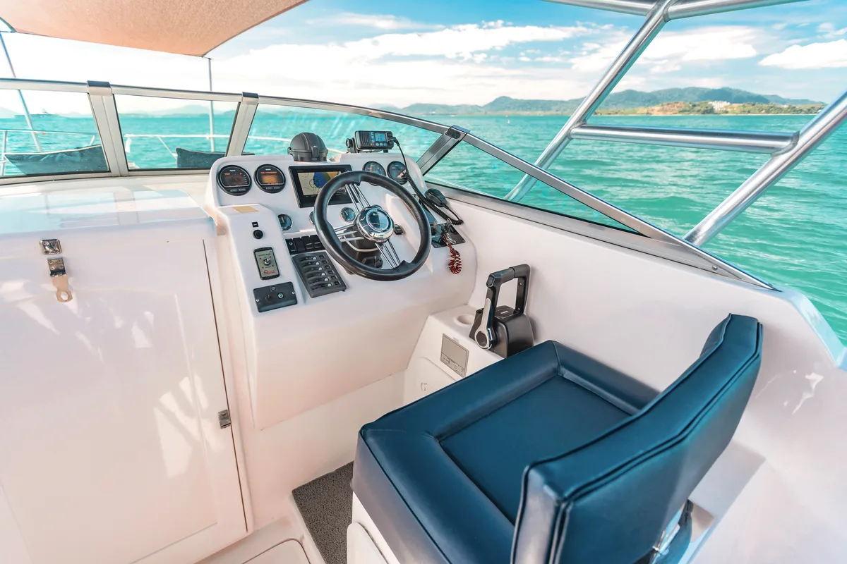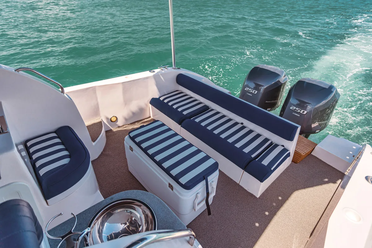 The infamous manufacturer Gulf Craft has managed to make sense of every inch of this 33ft boat, so that it offers an incredible amount of space in the bow and stern and even includes a cabin with a kitchenette and toilet.