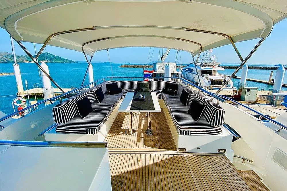 Elegance, refinement, comfort, and a taste for the pleasures of life: This stylish fly-bridge motor yacht offers up to 12 day guests grandiose tours with luxury and everything that makes a stay at sea unforgettable.